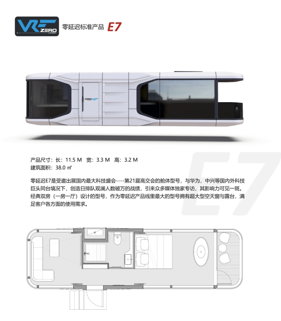 零延迟E7是受邀出展国内最大科技盛会-第21届高交会的舱体型号,与华为,中兴等国内外科技巨头同台境况下,创造日排队观澜人数破万的战绩,引来众多媒体独家专访,其影响力可见一斑。经典双房(一房一厅)设计的型号,作为零延迟产品线里最大的型号拥有超大型空天窗与露台,满足客户各方面的使用需求,